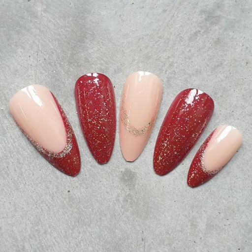 ✔️ Paznokcie w kształcie migdała. Paznokcie z czerwonym frenchem oraz brokatowym zdobieniem.