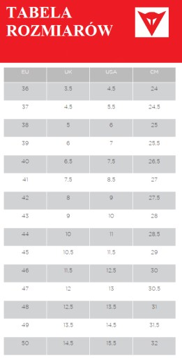 Tabela jest poglądowa, nie może stanowić podstawu do reklamacji produktu.