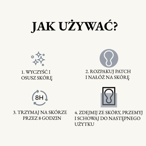 Upewnij się, że Twoja skóra jest czysta i sucha. W miejscu przyklejenia plastra nie należy stosować żadnych produktów do pielęgnacji skóry. Zdejmij plastikową folię i przyklej plaster. Nosić na noc lub na kilka godzin w ciągu dnia. Aby usunąć plaster, przytrzymaj skórę jedną ręką, a drugą ręką delikatnie usuń plaster. Spłucz wodą, umieść plaster z powrotem na osłonce (stroną z klejem skierowaną w dół) i przechowuj w zamykanej torebce.