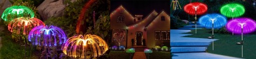 - Nazwa mówi sama za siebie: diody LED są ułożone w taki sposób, że wyglądają jak meduzyKonstrukcja wykonana jest ze stali nierdzewnej co podnosi prestiż lampy. Lampa zakończona kompozytowym grotem co ułatwi wbicie lampy w podłoże. W połowie wysokości lampy umieszczona jest platforma modułu solarnego, który jest wyposażony w akumulator zapewniający, że fajerwerki lśnią w ciemności.