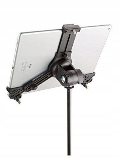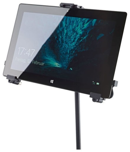 Zapewnij swoim tabletom bezpieczny i pewny chwyt: Uniwersalny uchwyt do tabletów może być regulowany w celu dostosowania do różnych rozmiarów tabletów bez użycia narzędzi i utrzymuje urządzenia bezpiecznie i skutecznie w wielu różnych sytuacjach. Czy to na scenie, w salach prób, czy w domu - dzięki gwintowi wewnętrznemu 3/8" uchwyt można szybko i łatwo przymocować na przykład do dowolnego statywu mikrofonowego. Indywidualnie regulowane ramiona podtrzymujące mogą pomieścić tablety o wysokości od 222 do 334 mm i szerokości od 128 do 232 mm (na przykład iPad, iPad Air, iPad Pro, Amazon Fire HDX 8.9, Samsung Galaxy Tab od 9.7, Google Nexus 9, Asus Transformer lub Microsoft Surface, a także Surface Pro). Głębokość tabletów może wynosić od 6 do 11 mm. Przy pierwszym użyciu uchwytu na tablet ustawienia ramion podporowych dokonuje się poprzez dostosowanie śrub zaciskowych do rozmiaru i głębokości tabletu. W przypadku innych zastosowań tablet można szybko i łatwo przymocować i odłączyć za pomocą zatrzasku. Zapewnia to maksymalną elastyczność i mobilność. Poręczna nakrętka motylkowa pozwala na regulację kąta nachylenia, dzięki czemu każdy użytkownik z łatwością znajdzie idealną dla siebie pozycję. Tablet może przełączać się między pozycją pionową i poziomą. Tablet jest utrzymywany w miejscu, nie ma niebezpieczeństwa, że sam zmieni pozycję.