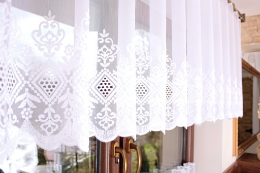 Przedmiotem sprzedaży jest biała haftowana firanka typu zazdrostka . Firaneczka jest haftowana na tkanie znanej pod nazwą ,,Aden,, tkanina jest nieco zbliżona do markizety , firaneczka jest miękka bardzo dobrze się układa , dosyć dobrze przepuszcza promienie słoneczne . Ogromną zaletą jest fakt że można taką zazdrostkę powiesić również na żabkach karnisza aby w pełni udekorować okno.