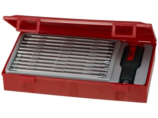 Zestaw z 12 części. Zawiera rękojeść wkrętaka oraz 11 dwustronnych trzonów wymiennych z grotem na każdym końcu.