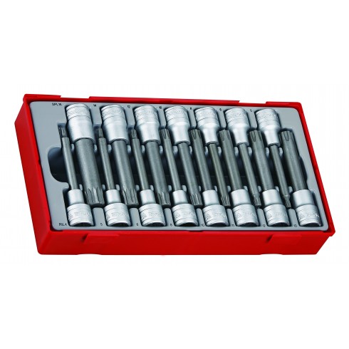 Zestaw składa się z 15 elementów. Zawiera nasadki trzpieniowe o długości 100 mm typu Ribe i XZN (chwyt kwadratowy 1/2").Dostarczany w pojemniku z tworzywa sztucznego z odłączaną pokrywą.Pasuje do skrzynek i wózków narzędziowych Teng Tools.
