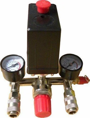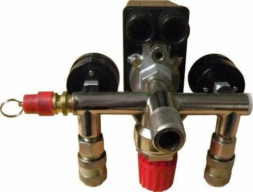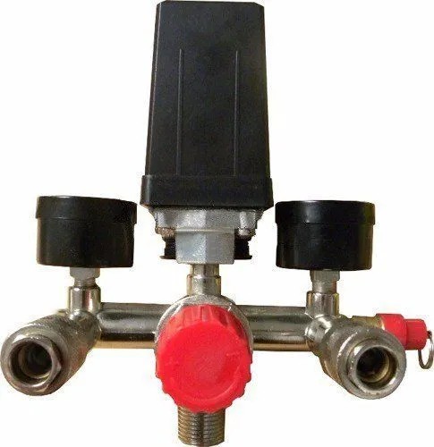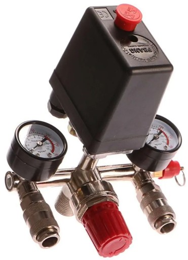 Wysokiej jakości wyłącznik ciśnieniowy (presostat) z kolektorem, dwoma szybkozłączkami i manometrami przeznaczony do kompresorów ciśnieniowych na 230V. Presostat wykorzystywany jest głównie w kompresorach o pojemności 24l, 50l, 60l, 100l, 150l