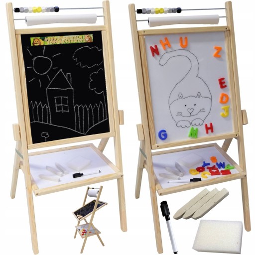 Drewniana, obrotowa tablica magnetyczno-kredowa to świetny pomysł na kreatywną zabawę Twoich Pociech. Nauka przez zabawę to najlepszy sposób na prawidłowy rozwój dzieci. Tablica jest idealnym miejscem na ćwiczenie pierwszych literek oraz cyferek. To także świetne miejsce do rozwijania zmysłu artystycznego przez wykonywanie wspaniałych rysunków. Z jednej strony jest to tablica do pisania markerami, z drugiej - tradycyjna tablica kredowa. Suchoscieralna strona tablicy jest magnetyczna - idealna do przyczepiania magnesów! Tradycyjna tablica kredowa to wspaniała zabawa w szkołę w domu!