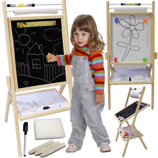 Drewniana, obrotowa tablica magnetyczno-kredowa to świetny pomysł na kreatywną zabawę Twoich Pociech. Nauka przez zabawę to najlepszy sposób na prawidłowy rozwój dzieci. Tablica jest idealnym miejscem na ćwiczenie pierwszych literek oraz cyferek. To także świetne miejsce do rozwijania zmysłu artystycznego przez wykonywanie wspaniałych rysunków. Z jednej strony jest to tablica do pisania markerami, z drugiej - tradycyjna tablica kredowa. Suchoscieralna strona tablicy jest magnetyczna - idealna do przyczepiania magnesów! Tradycyjna tablica kredowa to wspaniała zabawa w szkołę w domu!