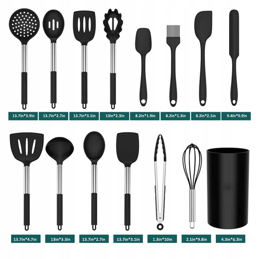 Zestaw 15 profesjonalnych silikonowych przyborów kuchennych zawiera szpatułkę cedzakową, szpatułkę stałą, głęboką chochlę do zupy, łyżkę do makaronu, elastyczną szpatułkę, szpatułkę łyżkową, szpachelkę cedzakową, szczotkę do nietoperza, trzepaczkę do jajek, łyżkę cedzakową, łyżkę stałą, szczypce kuchenne i uchwyt.