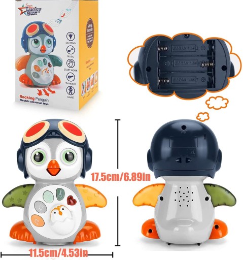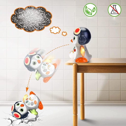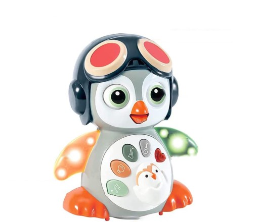 - Gdy w trakcie ruchu napotkasz przeszkodę, automatycznie zmieni ona kierunek i ruszy dalej do przodu.Wbudowano pięć melodii, a dłonie pingwina poruszają się w górę i w dół w rytm muzyki.