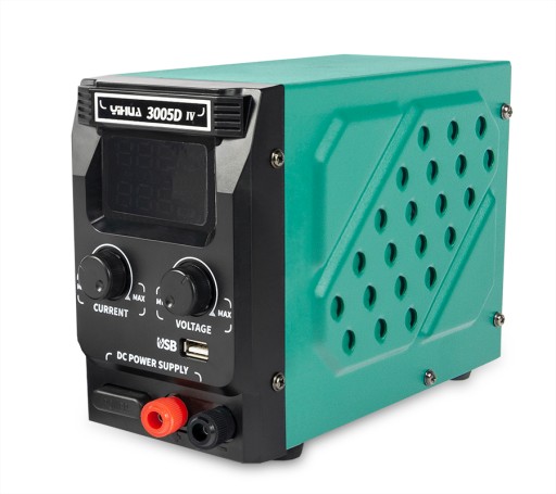 Zasilacz Yihua 3005D-IV z płynną regulacją napięcia w zakresie 0-30V i stabilizacją prądową w zakresie 0-5A. Urządzenie wyróżnia się czytelnym wyświetlaczem LED, który pokazuje wartości napięcia, natężenia i pobór mocy podłączonego sprzętu. Zasilacz Yihua 3005-IV to impulsowy zasilacz zbudowany na wysokiej jakości przetwornicy napięcia. Przetwornica impulsowa ma bardzo wysoką sprawność energetyczną w porównaniu do zasilaczy transformatorowych - nie wydziela tyle ciepła co transformator i jest lekka. Ciepło powstałe w przy pracy jest odprowadzane przez aktywny wentylator, który włącza się kiedy zasilacz się nagrzeje. Urządzenie jest przystosowane do pracy ciągłej. Zasilacz można łączyć szeregowo, równolegle lub symetrycznie z drugim zasilaczem o podobnej konstrukcji.