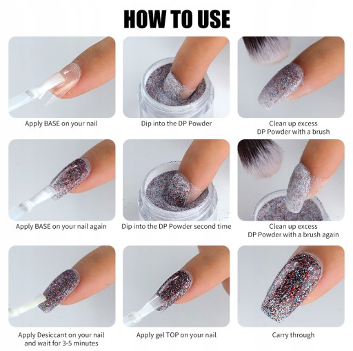 Użyj kroków proszku Opiłuj i oczyść paznokcie, a następnie nałóż bazę Nałożyć bazy, końcówkę całego paznokcia zanurzyć w pudrze, po wyschnięciu zetrzeć nadmiar pudru. Krok 2 Powtórz 2 ~ 3 razy, aby uzyskać żądany efekt kolorystyczny. Nałożyć aktywator zanurzeniowy, suszyć przez 60s na powietrzu. Opiłuj powierzchnię paznokci, aby była gładka. Nałóż top coat i poczekaj, aż całkowicie wyschnie.