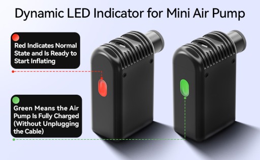 - Gdy pompka rowerowa zostanie w pełni naładowana, automatycznie przełącza się w stan chroniony. Ciągłe zielone światło przypomina o wyłączeniu zasilania.