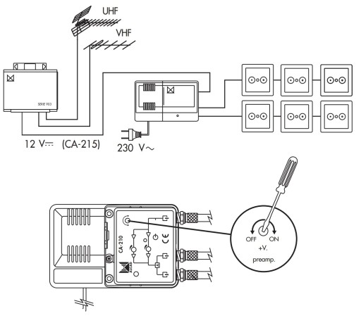 Wzmacniacz CA-215 stosowany jest jako wzmacniacz abonencki w celu rozprowadzenia sygnału do kilku lub kilkunastu odbiorników. Podstawową cechą wzmacniacza jest praca w zakresie 40 - 400 MHz oraz 470 - 862 MHz. Dzięki niezależnej regulacji wzmocnienia w zakresie VHF i UHF możliwe jest dopasowanie wzmocnienie do poziomu sygnału w danym paśmie. Ułatwia to budowę instalacji antenowych wykorzystujących jeden kabel do sprowadzenia sygnałów z wszystkich anten (po zsumowaniu za pomocą zwrotnicy). Wzmacniacze mogą być wykorzystywany w niektórych sieciach kablowych lub instalacjach zbiorczych. Ze względu istnienie luki w paśmie pracy, są to sieci nie wykorzystujące kanałów S30 - S38. Wzmacniacz jest zalecany do stosowania w sytuacjach kiedy poziom sygnału jest niski. Dodatkowo możliwe jest także zasilanie przedwzmacniaczy. Bezpieczeństwo podczas użytkowania wzmacniacza Wzmacniacz CA-215 jest zasilany z wbudowanego zasilacza stabilizowanego Nie jest przeznaczony do pracy w otwartej przestrzeni. Nie może być montowany w warunkach dużej wilgotności oraz w pobliżu grzejników i innych źródeł ciepła. Wymagane jest zapewnienie wentylacji. Ze względu na możliwość uszkodzenia, nie należy podłączać zasilania dopóki wszystkie połączenia nie są wykonane poprawnie. Wzmacniacz CA-215 umożliwia zasilanie przedwzmacniaczy napięciem 12 V i maksymalnym prądem 60 mA, co pozwala na stosowanie typowych przedwzmacniaczy płytkowych. Dane techniczne