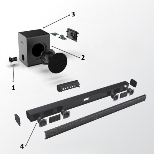 - Głośniki: 4 x 2" 10 W i 2 x membrana basowa + 1 x 5,25" 30 W subwoofer