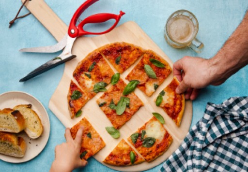 - Sprytnie zakrzywione ostrza Scizzy kroją od góry, aby utrzymać dodatki na miejscu, a ręce z dala od gorącego jedzenia.