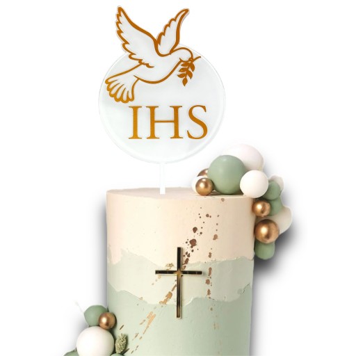 TOPPER NA TORT Biały PIERWSZA KOMUNIA ŚWIĘTA IHS Złoty Napis