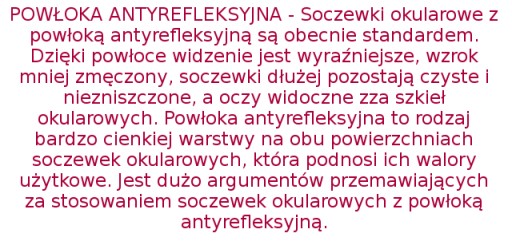 - zakres mocy -8,00 dpt do +4,00 dpt cyl +2,00 dpt - możliwość wykonania soczewek o innych mocach