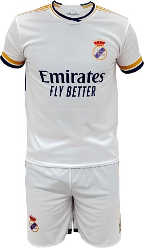 Strój REAL z getrami w wersji domowej, z możliwością wydrukowania na nim spersonalizowanego nadruku. Wykonany z wytrzymałej i dobrej jakościowo dzianiny. Materiał jest szybkoschnący, oddychający i przyjemny w dotyku.
