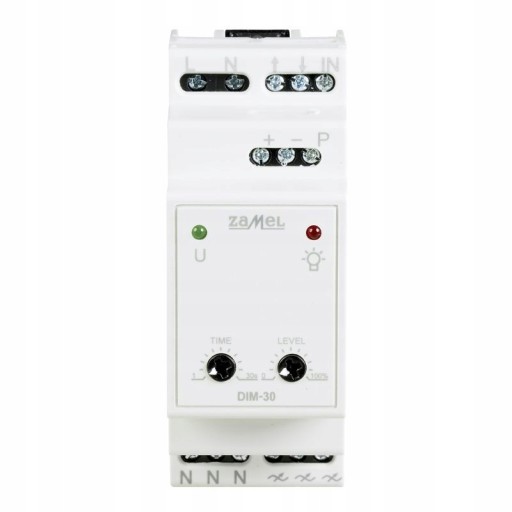 Ściemniacz DIM-30 ze względu na zastosowane rozwiązania sprzętowe oraz programowe umożliwia płynną regulację natężenia oświetlenia dla różnych źródeł światła. Współpracuje z konwencjonalnym oświetleniem żarowym i halogenowym 230 V AC, źródłami światła zasilanymi przez transformatory elektroniczne i toroidalne, wybranymi ściemnialnymi żarówkami LED oraz ściemnialnymi świetlówkami kompaktowymi CFL. Wybór typu obciążenia, nastawa minimalnego poziomu napięcia wyjściowego oraz czasów rozjaśniania/ściemniania ułatwia konfigurację i gwarantuje kompatybilność większą niż w przypadku stosowania typowych ściemniaczy oświetlenia. Do sterowania można wykorzystać podświetlane łączniki monostabilne (przyciski) pojedyncze oraz podwójne, potencjometry osprzętowe 1÷10 V oraz inne układy automatyki z wyjściami w standardzie 1÷10 V. Ściemniacz wykonany jest w wersji modułowej (obudowa 2-MOD) do montażu w rozdzielnicy (TH-35). Wyjście ściemniacza posiada zabezpieczenie zwarciowe, przeciążeniowe oraz termiczne co gwarantuje długą i niezawodną pracę.