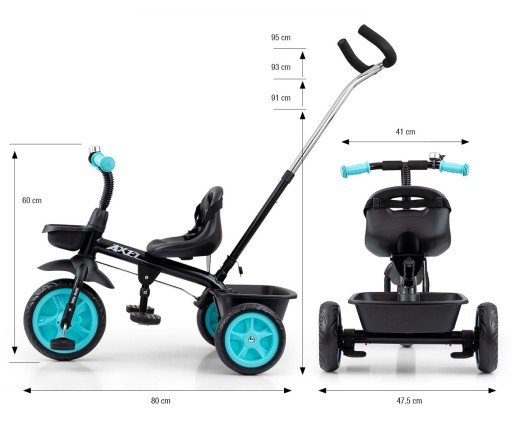 Najważniejszą zaletą rowerka trójkołowego AXEL jest frajda jaką dostarcza dzieciom, ponadto rodzicom zapewnia kontrolę podczas jazdy i pewność, że dziecko jest bezpieczne.