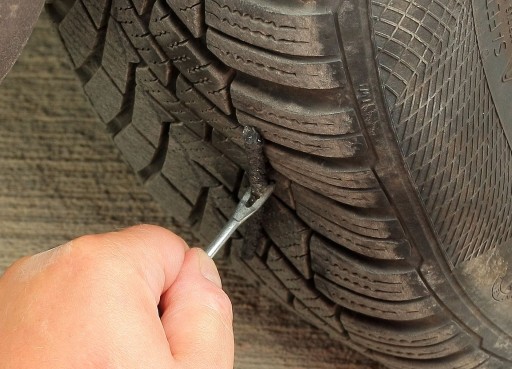 - miejsce uszkodzenia opony oznacz kredą, następnie wyjmij gwóźdź lub inne ciało obce wbite w oponę