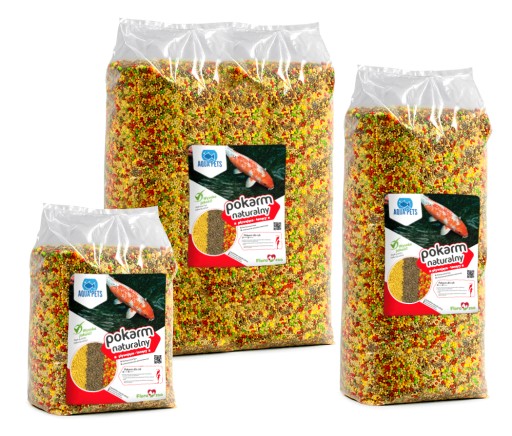 Pokarm wybarwiający, dla wszystkich kolorowych karpi koi, złotych rybek, innych barwnych ozdobnych ryb karpiowatych hodowanych w oczkach wodnych, regularnie podawany wydatnie intensyfikuje czerwone ubarwienie ryb.