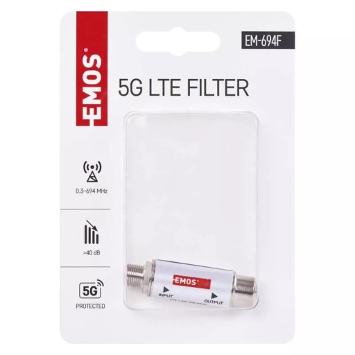 filtr 5G: tak|ilość wejść: 1|ilość wyjść: 1|izolacja między wejściami: nie dotyczy|LTE filtr: tak|maksymalny poziom sygnału na wyjściu: nie dotyczy|opakowanie: 1 szt., pudełko|pasmo tłumienia: 700–2 400 MHz|poziom szumów: nie dotyczy|produkt: 5G filtr|przejście dla zasilania wzmacniaczy: tak, 300 mA|regulacja zysku: nie dotyczy|rozstaw otworów: nie dotyczy|stopień ochrony: IP20|tłumienie w paśmie: >40 dB|wejścia: złącze F|wymiary: 16 × 40 mm|wzmocnienie: nie dotyczy|zakres częstotliwości: 0,3–694 MHz|zasilanie: nie dotyczy|złącza: złącze F