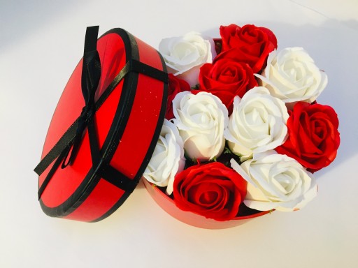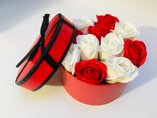 ❤️ ❤️ Kwiaty mydlane w kolorze czerwonego I BIAŁEGO . w pudełku z pokrywą.