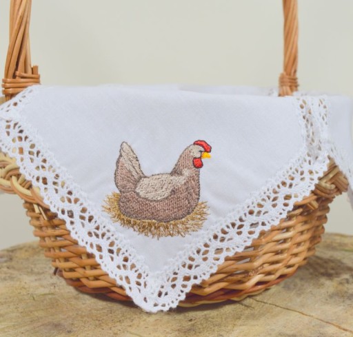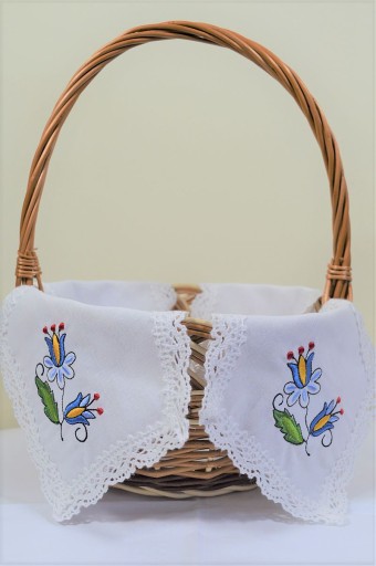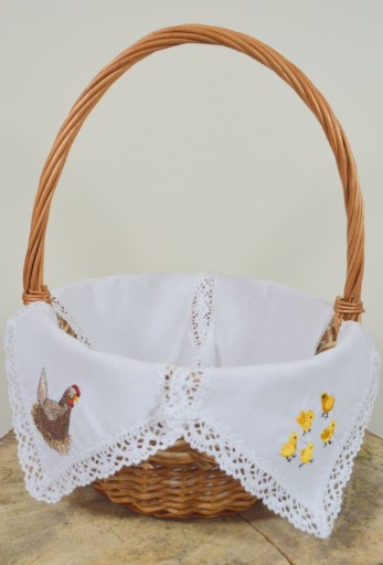 Przedstawiamy UNIWERSALNĄ serwetkę do koszyczka Wielkanocnego zdobioną bawełnianą koronką, wykonaną w naszej pracowni. Urocze hafty dodają koszyczkowi nietuzinkowego charakteru!