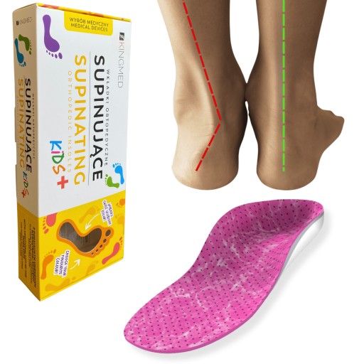 Wkładki Ortopedyczne Supinujące dedykowane są dla dzieci, które zmagają się z koślawością kolan i pięt (nadmierna pronacja). Wada ta charakteryzuje się wygięciem kolan do wewnątrz oraz pochyleniem się stopy na jej wewnętrzną krawędź. Zastosowane wyższe łoże pięty oraz łuków podłużnego zewnętrznego i podłużnego wewnętrznego gwarantuje odpowiednią stabilizację stopy oraz kolan. Korytkowy kształt wkładki zapobiega odchylaniu się pięty na boki, profilując tyłostopie i śródstopie.
