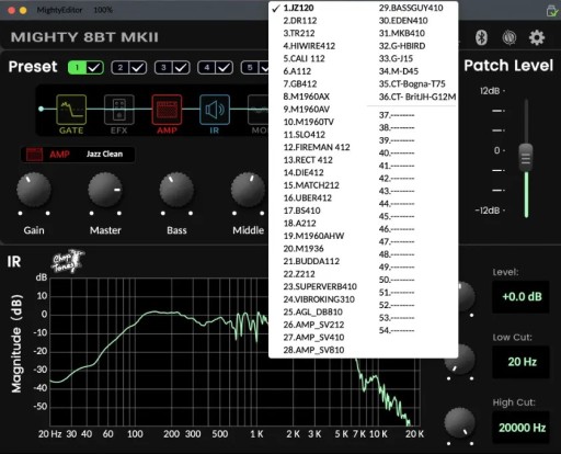 Edytowanie i zapisywanie ustawień wstępnych może odbywać się w studiu lub w podróży, dzięki aplikacji Mighty Amp na urządzenie inteligentne (iOS/Android) lub oprogramowaniu Mighty Editor™ (Mac/PC). Możesz nawet załadować pliki IR innych firm za pomocą oprogramowania edycyjnego Mighty Editor™, aby rozszerzyć swoje brzmienie. (Możesz załadować pliki IR w dowolnym formacie WAV, Mighty Editor™ automatycznie przekonwertuje je na urządzenie do formatu 32 bity/48 kHz.)