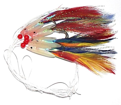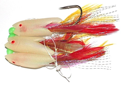 TRZY PRZYNĘTY - KORPUS FLUORESCENCYJNY Z BARWNYM CHWOSTEM + TRZY KORALIKI FLUORESCENCYJNE - ZIELONE.