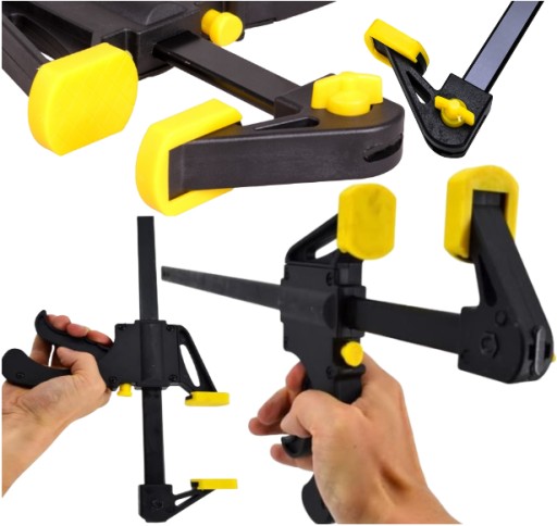 Nakładki zostały wykonane z tworzywa sztucznego, co pozwala chronić mocowany materiał przed zarysowaniem. Dzięki szybkiej regulacji docisku ścisk można obsługiwać jedną ręką.