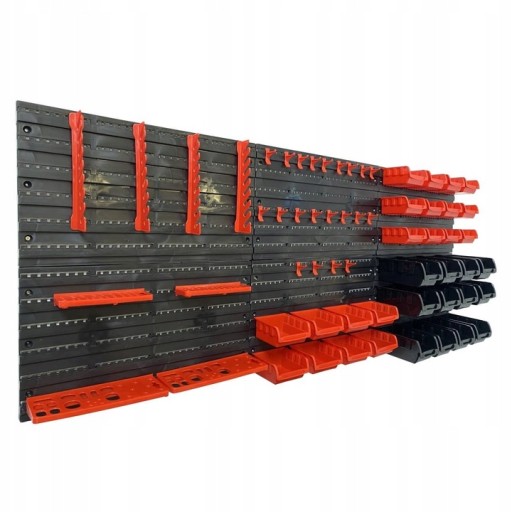 Tablica Narzędziowa Warsztatowa 66 Elementów Zestaw pojemników i tablic Zestaw zawiera następujące (plastikowe) elementy / części: 12 x pudełka - 160 x 102 x 75 mm 20 x pudełka - 100 x 100 x 50 mm 28 x Uchwyt narzędziowy 6 x panele ścienne - 475 x 272 x 15 mm
