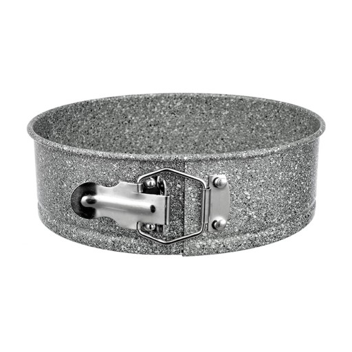 Tortownica wykonana z blachy stalowej, pokrytej specjalną nieprzywierającą (non-stick) powłoką granitową GRANITE COATING w kolorze szarym.