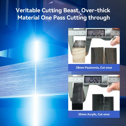 Zaprojektowany z myślą o profesjonalistach, zapewnia niezwykłą skuteczność. Dzięki swojej wydajności może bez wysiłku przeciąć akryl o grubości 25 mm, drewno sosnowe i tungowe o grubości 30 mm, poradzić sobie z płytami MDF o grubości 12 mm i precyzyjnie przyciętymi blachami ze stali nierdzewnej o grubości 0,3 mm w jednym przejściu.