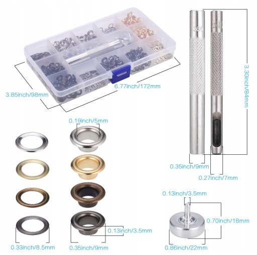 - Ten zestaw oczek zawiera dziurkacz, pasujący trzpień i 400 zestawów oczek (każdy zestaw zawiera 1 oczko i 1 podkładkę) oraz pudełko do przechowywania małych przelotek.