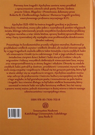 Pierwszy tom tragedii Ajschylosa zawiera nowy przekład z opracowaniem czterech sztuk poety: Persów, Siedmiu przeciw Tebom, Błagalnic i Prometeusza, dokonany przez Roberta R. Chodkowskiego, badacza i tłumacza tragedii greckiej, emerytowanego profesora zwyczajnego KUL.