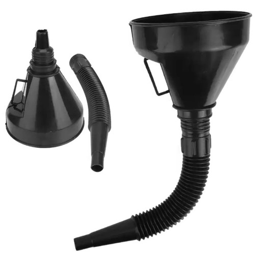 Dwuczęściowy lejek do paliwa / oleju wyposażony w sitko filtrujące. Wlew o szerokiej średnicy oraz odłączana, giętka rurka ułatwiają nalewanie płynów do zbiornika. Wykonany z tworzywa odpornego na działanie przelewanych substancji.