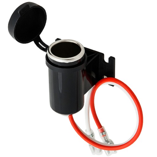 Przeznaczone do samodzielnego montażu gniazdo zapalniczki samochodowej wyposażone w przewody z konektorami oraz hermetyczną klapką zabezpieczającą.