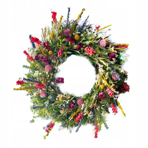 Sztuczny wiosenny i letni wieniec na drzwi, dobrze wykonany i w żywych kolorach, wygląda realistycznie i pięknie