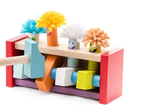 Drewniana zabawka uczy rozpoznawania kształtów i kolorów, rozwija zdolności motoryczne i logiczne myślenie.