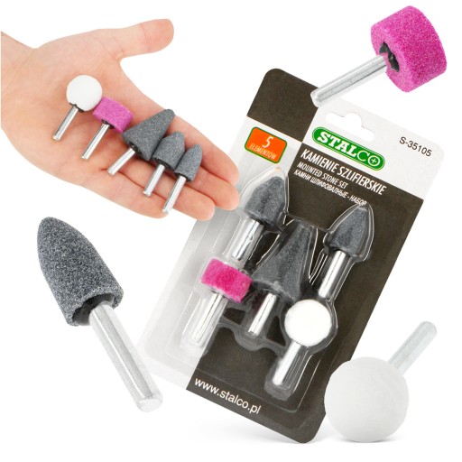 Zestaw zawiera aż 5 sztuk kamieni w różnych kształtach i rozmiarach, tak aby dopasować element do polerowanej powierzchni. Kształty kamieni to walec, stożek lub kula. Dzięki nim szlifowanie stanie się łatwe, szybkie i skuteczne.