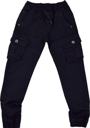 Po bokach nogawek naszyte dwie praktyczne kieszenie bagażówki, zapinane na guzik.