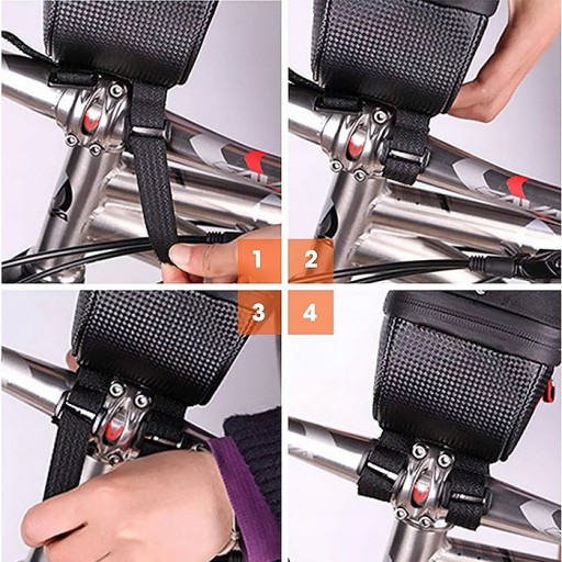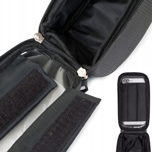 Torba jest w całości usztywniona, wykonana z wytrzymałego materiału. Wygodna w użyciu, pozwala na bezproblemowe korzystanie ze wszystkich funkcji telefonu podczas jazdy na rowerze. Montowana jest do ramy roweru na regulowane rzepy. Zmieszczą się w niej urządzenia o przekątnej max. 6,8'