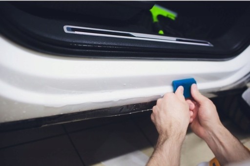 - Folię po spryskaniu roztworem poślizgowym, przyłóż do oklejanego elementu. Raklą wyprowadź płyn znajdujący się pod folią zaczynając od środka i kierując się ku brzegom.
