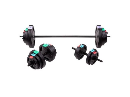 - Zawartość zestawu: 2 obciążenia 10 kg, 3 gryfy, 4 obciążenia 2.5 kg, 4 obciążenia 5 kg, 6 obciążenia 1.25 kg, 6 zacisków