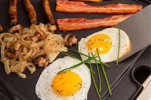 Płaska strona płyty żeliwnej jest idealna do przygotowywania delikatnych ryb, owoców morza, naleśników, placków ziemniaczanych czy jajek.