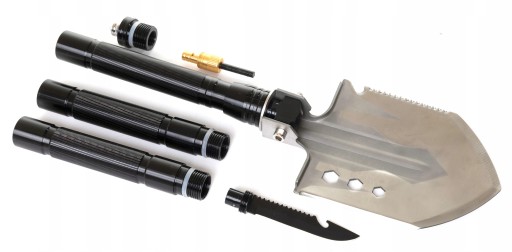 Łopata jest składana i może być rozłożona do trzech długości - 38 cm / 54 cm / 75 cm. Głowica łopaty może być zablokowana pod kątem od 0° do 180°.