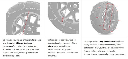Po zamontowaniu łańcucha śniegowego na kole nie ma konieczności zatrzymania pojazdu w celu ponownego naprężenia produktu. System König ATC umożliwia osiągnięcie optymalnego naprężenia i wyśrodkowania łańcucha na oponie w sposób całkowicie automatyczny podczas jazdy.